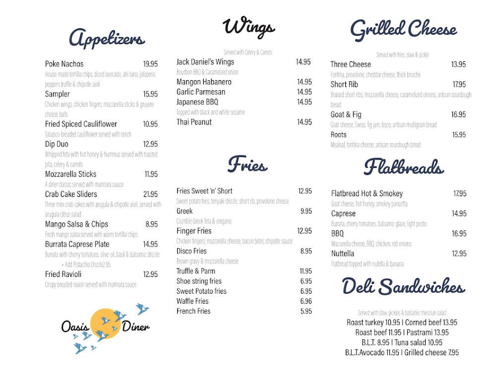 Oasis Diner's menu showcases 176 delicious options. Breakfast items range from classic pancakes to gourmet omelets, available all day. Lunch offers innovative burgers and unique sandwiches, such as the California Panini. The diner also features a selection of salads, wings, and sides. Don't forget to explore the dessert menu, which includes tantalizing treats. Kid-friendly dishes make it a wonderful choice for families. The diverse culinary options cater to various tastes, ensuring every guest finds something to enjoy.